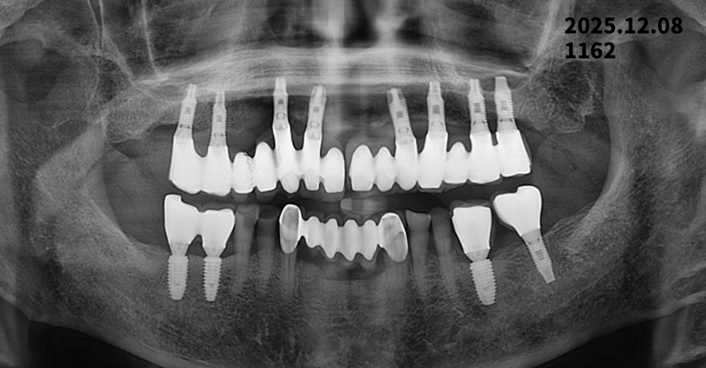 2011년 임플란트 식립 후 약 14년이 지난 2025년 정기검진 파노라마 X-ray를 통해